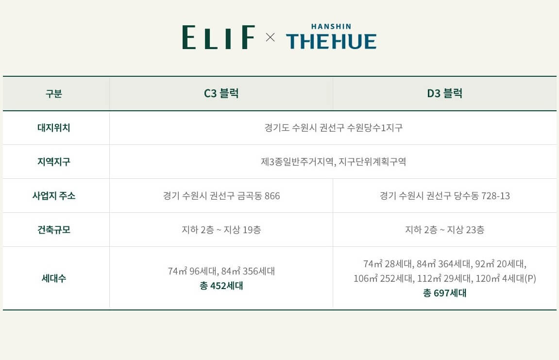 수원당수 엘리프한신더휴는 전용면적은 84㎡, 99㎡형으로 구성되며 D3블록 총 697가구가 공급됩니다. 전 가구 남향위주로 배치되어 있으며, 전세대가 거실/주방 맞통풍이 가능한 4베이 4룸 혁신평면이 적용됐습니다.